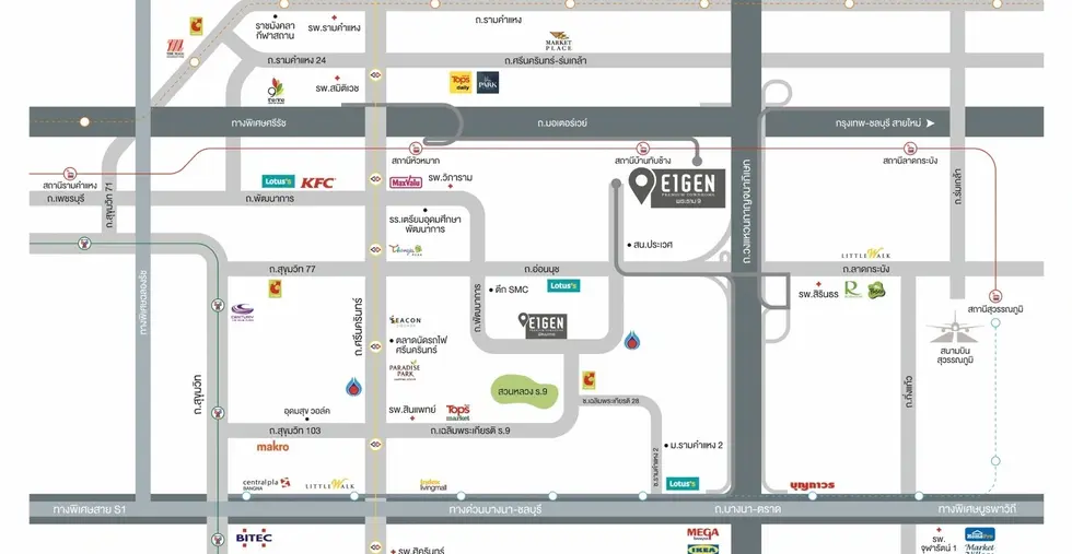ใกล้ทางด่วนศรีรัช, มอเตอร์เวย์, ถนนพัฒนาการ, อ่อนนุช, ศรีนครินทร์, รามคำแหง